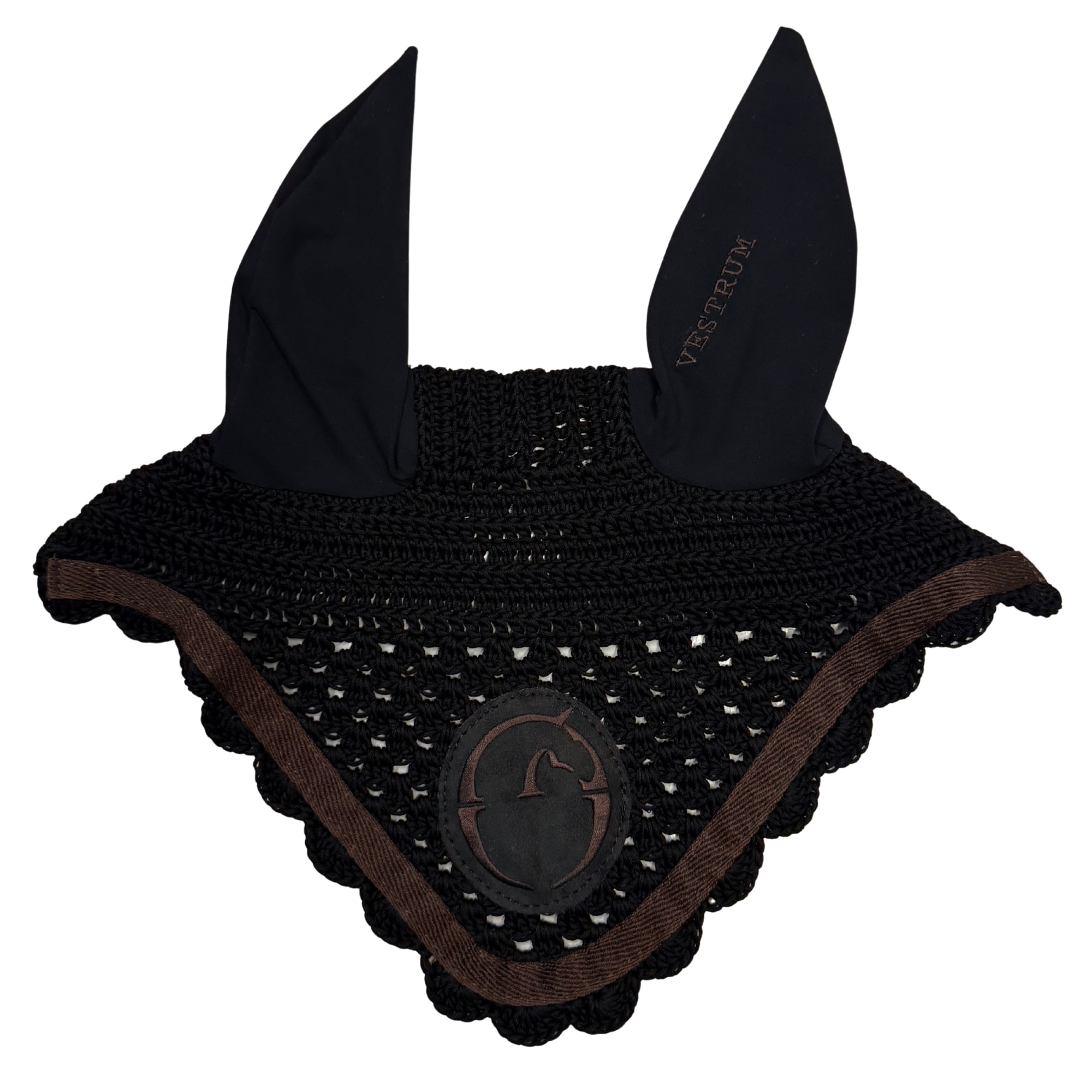 The Leeds fly bonnet for horses is very sleek and elegant. The fly bonnet from Vestrum is black knitted with the Vestrum logo in black on the front and “Vestrum” written in black on the left ear.