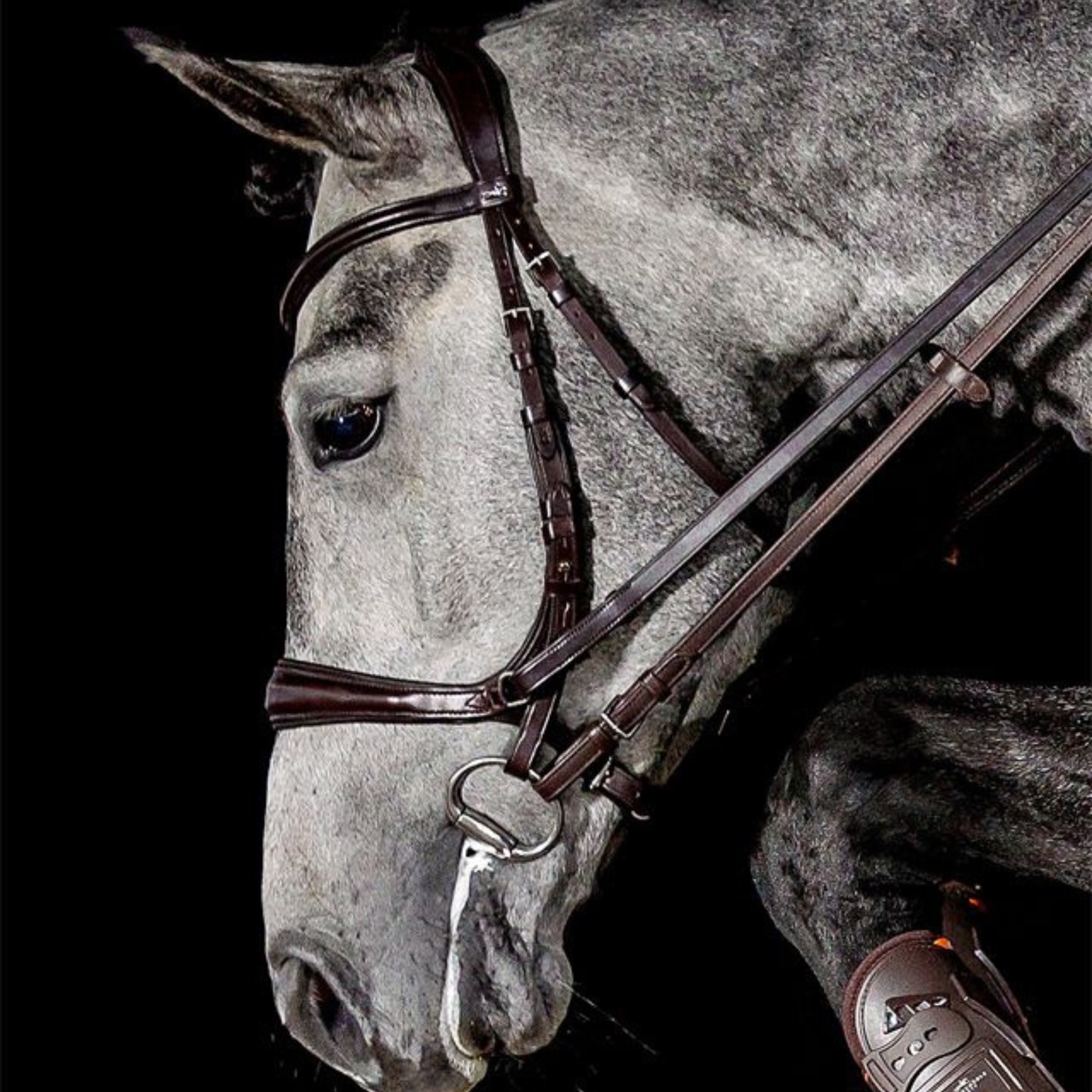 At the same time, Equitus Theta is a versatile 3 in 1 bridle. Thanks to the proven button rivets, the bridle can also be used with a regular bit by attaching cheekpieces. It is also possible to ride with two pairs of reins, where one rein is attached to the bit and the other to the D rings on the noseband. This can be a good option for sensitive horses or when introducing a horse to the bit.