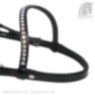 This is a super stylish and elegant bridle in the model Venice in smooth leather that has an extra small finish with the cappuccino colored padding on the noseband. The noseband on this bridle is an XS 4 cm wide which means it tapers towards the sides, the closure of the noseband is buttoned back. The neck piece has a very soft and light padding for increased comfort for the horse, where the padding is black. The bridle has stainless steel buckles and an arched headband with Swarovski crystals Tiffany XL 8 mm in the color Col. Topaz with a silver frame.