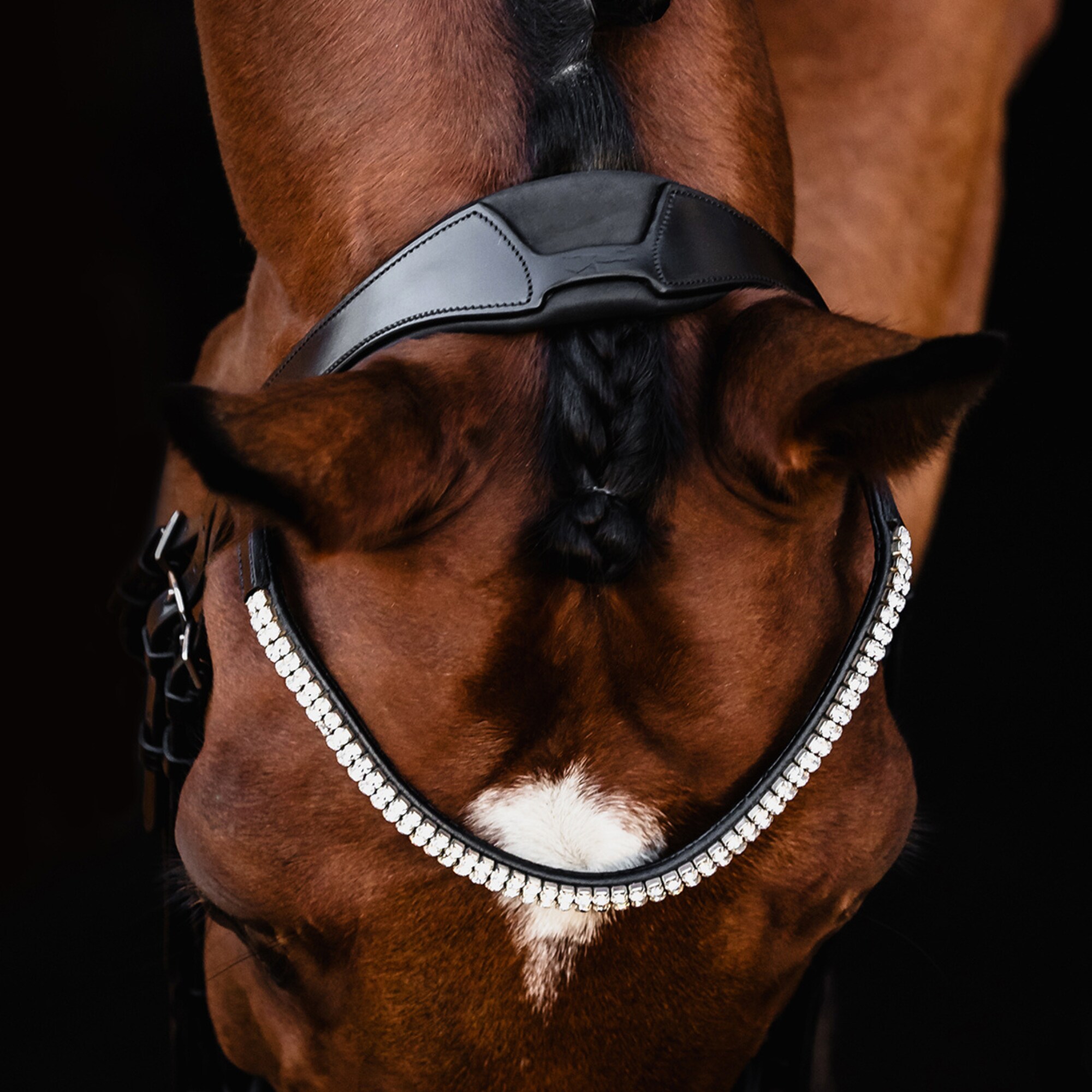 The Johnny Bridle from Isabell Werth’s exclusive collection with Schockemöhle Sports is anatomically designed for optimal comfort and fit, with round-stitched side pieces and a jaw strap, and a pre-shaped noseband with special anatomical padding. The bridle has softly padded and embedded rings at the noseband’s cut-back attachment, an anatomical headpiece with proven fit, and a narrow browband decorated with two rows of elegant square crystals.