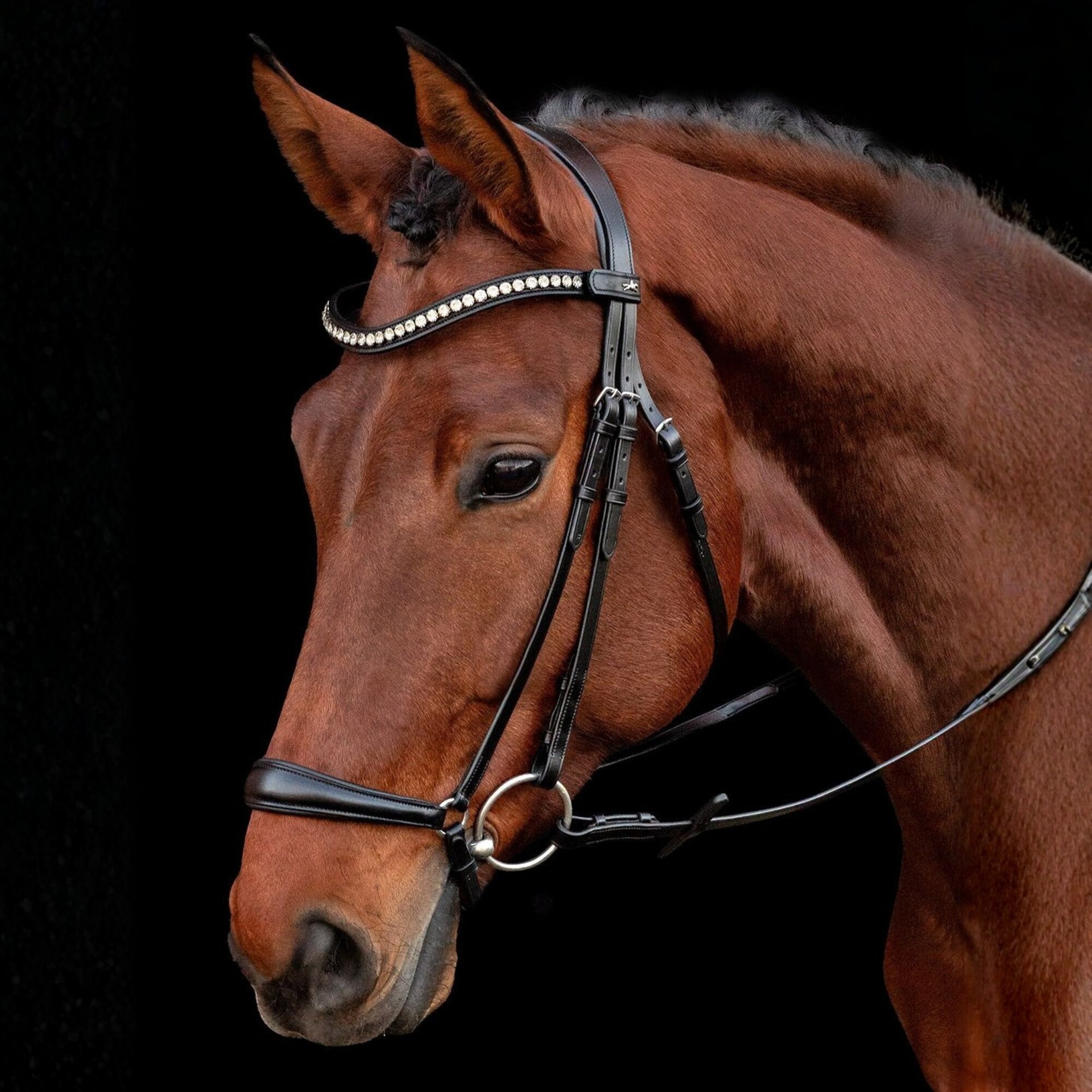 An anatomically shaped headpiece is softly padded and helps distribute pressure evenly over the poll, contributing to greater comfort during riding.