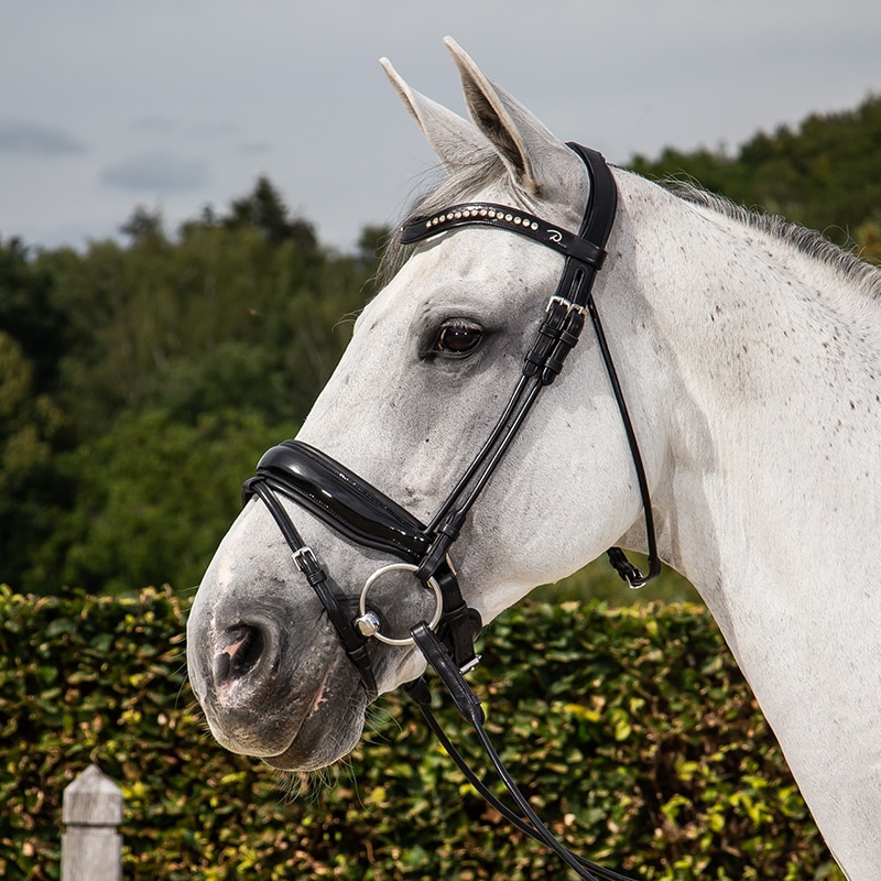 Crystal browband included. Rolled leather reins sold separately. Available in Black or Brown, with or without a patent finish. Matching coloured noseband or with white lining.