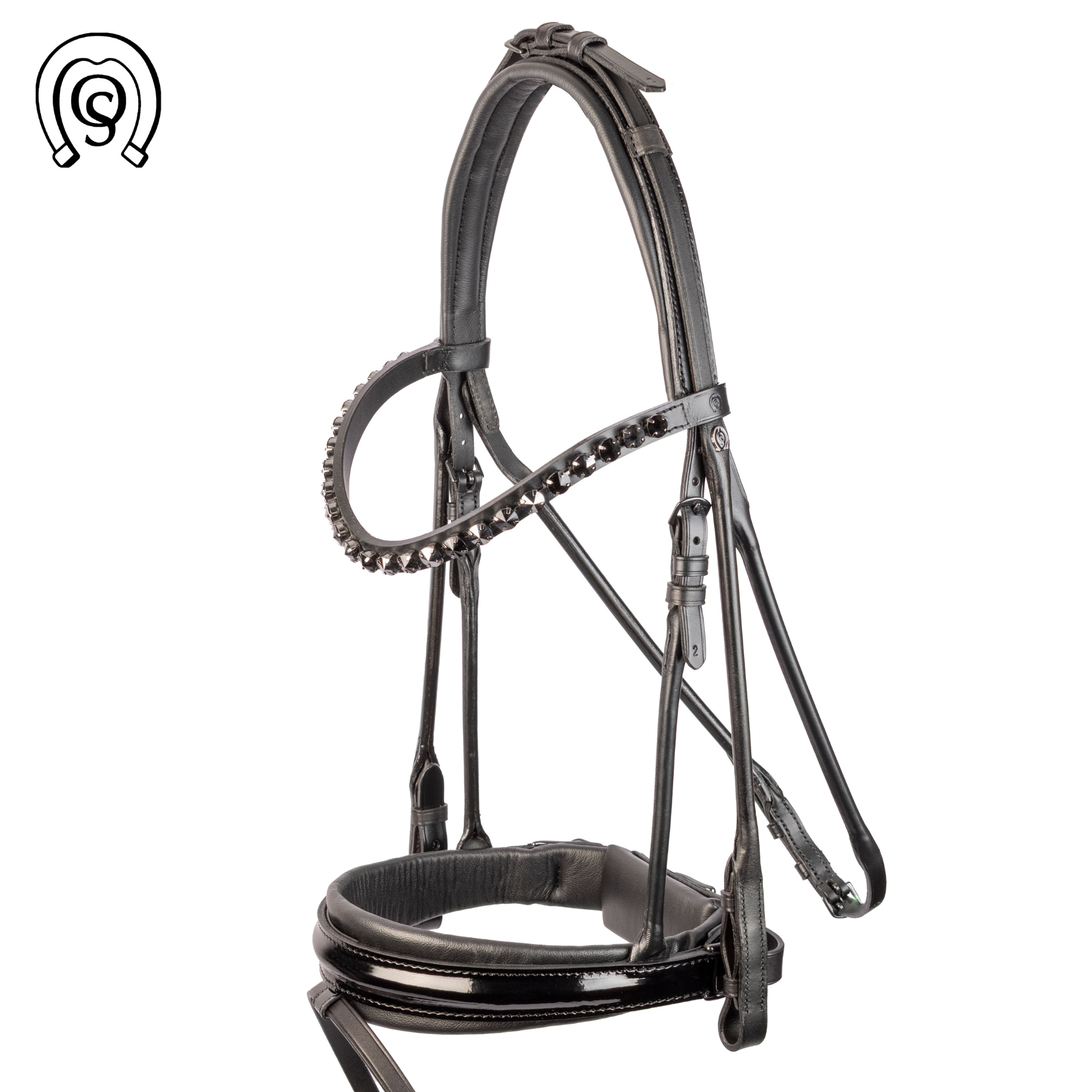 The Genua bridle is made of black round-sewn leather with tone-on-tone padding. The noseband features black patent leather, and the browband is a beautifully curved design adorned with 10 mm Swarovski Rivoli crystals, alternating in Jet and Jet Hematite.