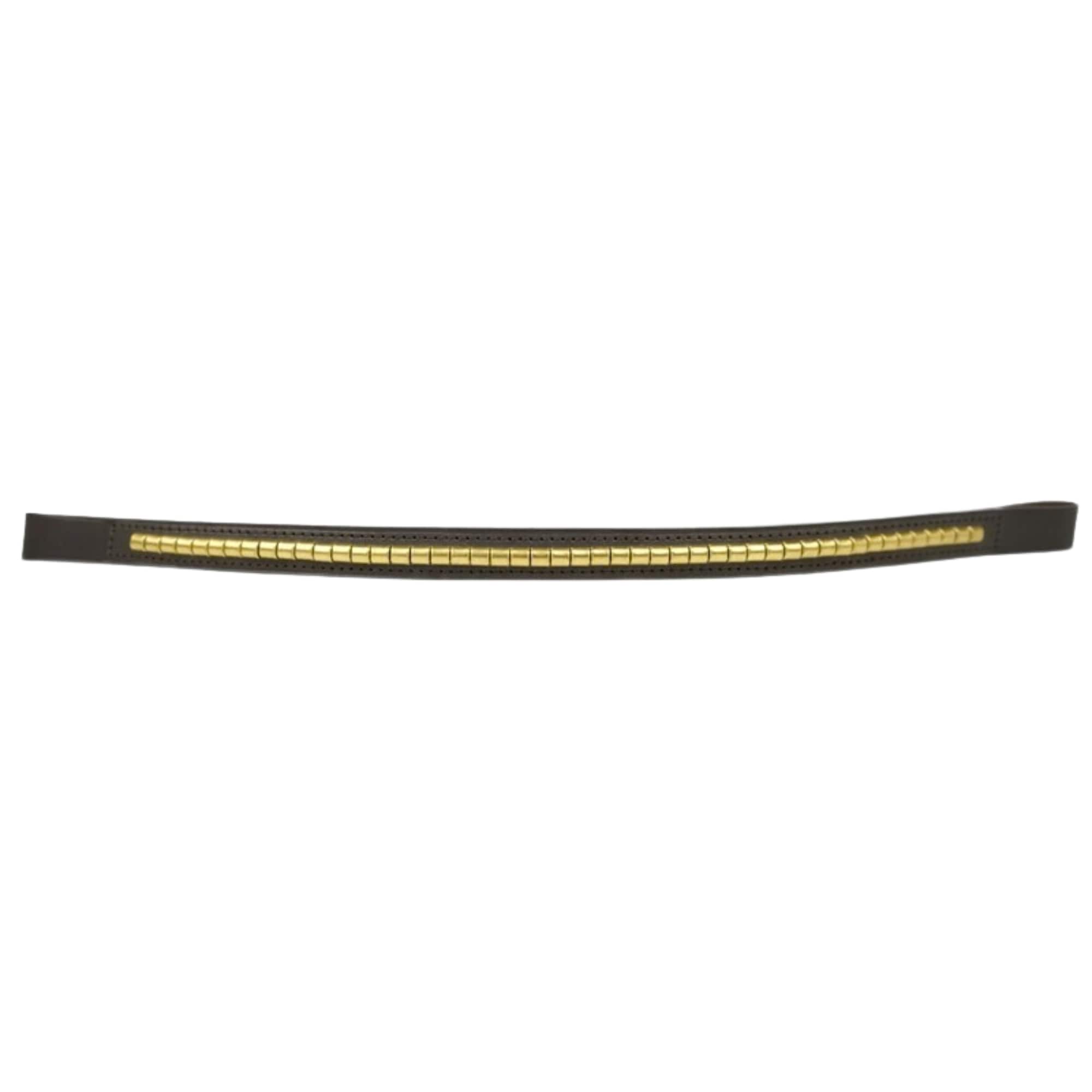 The browband is decorated with an inlaid silver-coloured clincher, giving it an elegant and timeless character. The golden metal strip creates a sophisticated contrast against the brown leather, adding an exclusive yet understated finish to the bridle.