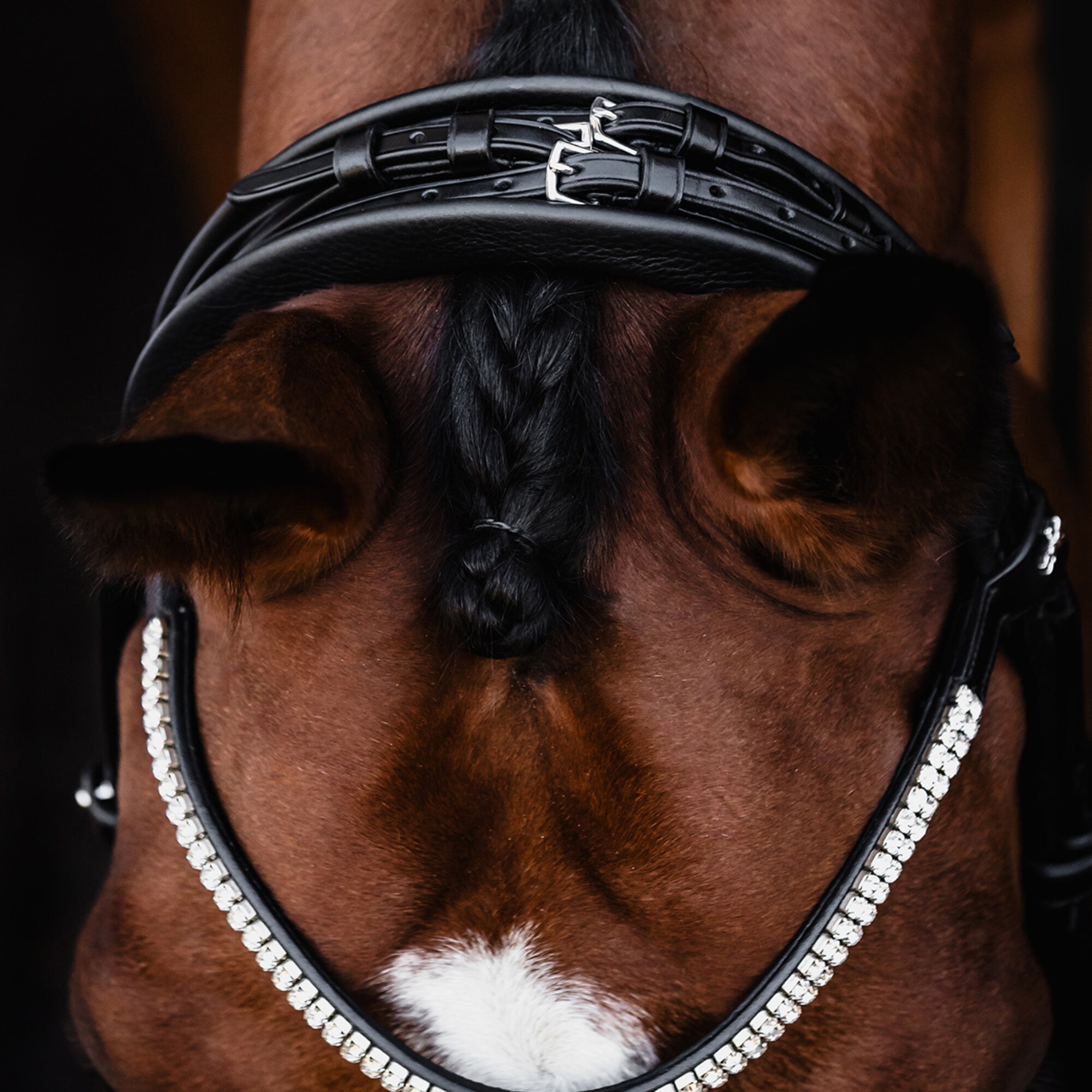 The Bella Rose Double Bridle from Isabell Werth’s exclusive collection with Schockemöhle Sports is anatomically designed for optimal comfort and fit. It comes with round-stitched cheekpieces, an innovative headpiece that can be adjusted at the neck for perfect comfort and fit, and a narrow browband adorned with two rows of elegant square crystals. The pre-shaped noseband features special anatomical padding, and the bridle has softly padded and embedded rings at the noseband’s cut-back attachment.
