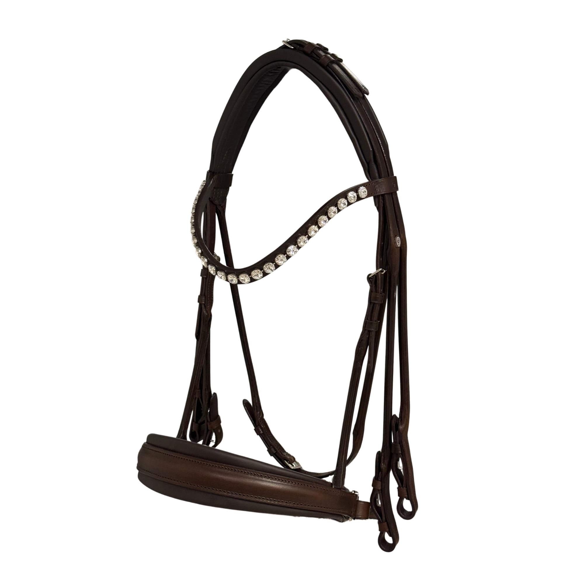 The browband is slightly curved and adorned with Swarovski crystals for a luxurious touch. The crystals are 10 mm Rivoli in Crystal. All buckles on the bridle are silver-coloured.