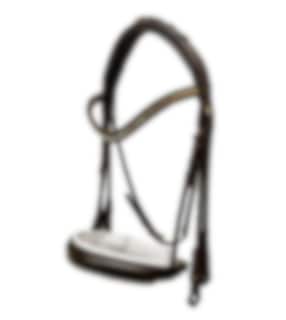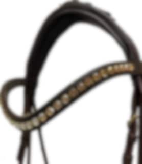 The browband on the double bridle is in the model Tiffany with 8 mm big Swarovski crystals in the color Golden Shading, the crystals becomes lighter and lighter towards the browbands center point. All Swarovski crystals on the browband has gold setting to match the buckles in brass.