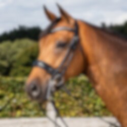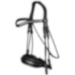 This rolled leather double bridle from Dy’on comes with many advanced features such as the ergonomic design, extra wide noseband that tapers off and curves at the sides to reduce the risk of pinching between the bit and noseband and the crank noseband fastening. The anatomic design headpiece provides added space around the ears whilst the cheek pieces are attached to the noseband sides for extra comfort. In addition, the headpiece feature neoprene padding and a soft sheep leather lining (without the fleece). The diamanté browband comes as standard with this bridle. Available in Black or Brown, with or without a shiny patent finish and with a matching coloured or white lined noseband. Reins not included.