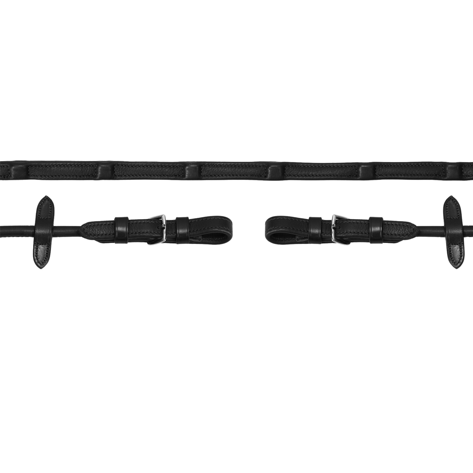 The core of the leather reins features a tear-resistant nylon reinforcement, comparable to the material used in a safety belt, running through the entire rein, including the bit loops. The reins are round sewn, 16 mm wide and equipped with integrated rein stops that provide a secure grip and help maintain an even rein length.