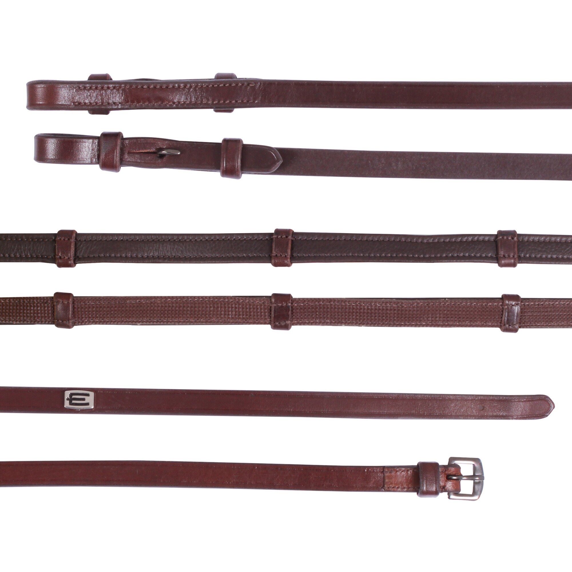 These hunter reins from by Equality Line are made from exclusive Italian leather, with leather on one side and rubber on the other for a secure and comfortable grip. The discreet tone on tone stitching gives a clean, refined look, while the elegant gunmetal buckles and silver E logo complete the design.
