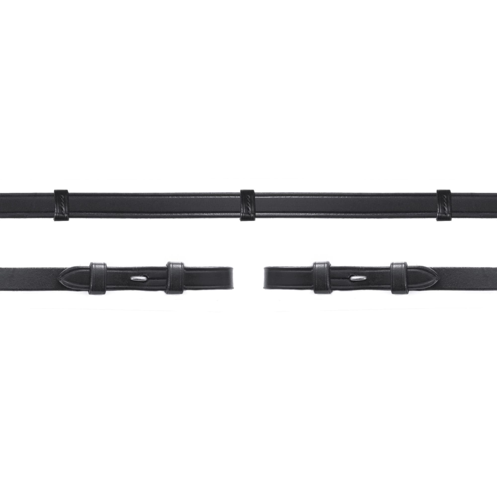 Slim black leather reins from Schockemöhle Sports with integrated stops and concealed buckles.