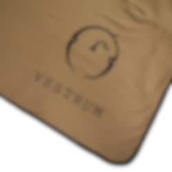 The fleece rug is chestnut brown with refined black details, including the Vestrum logo and text on the left side, giving it an exclusive and sophisticated appearance.