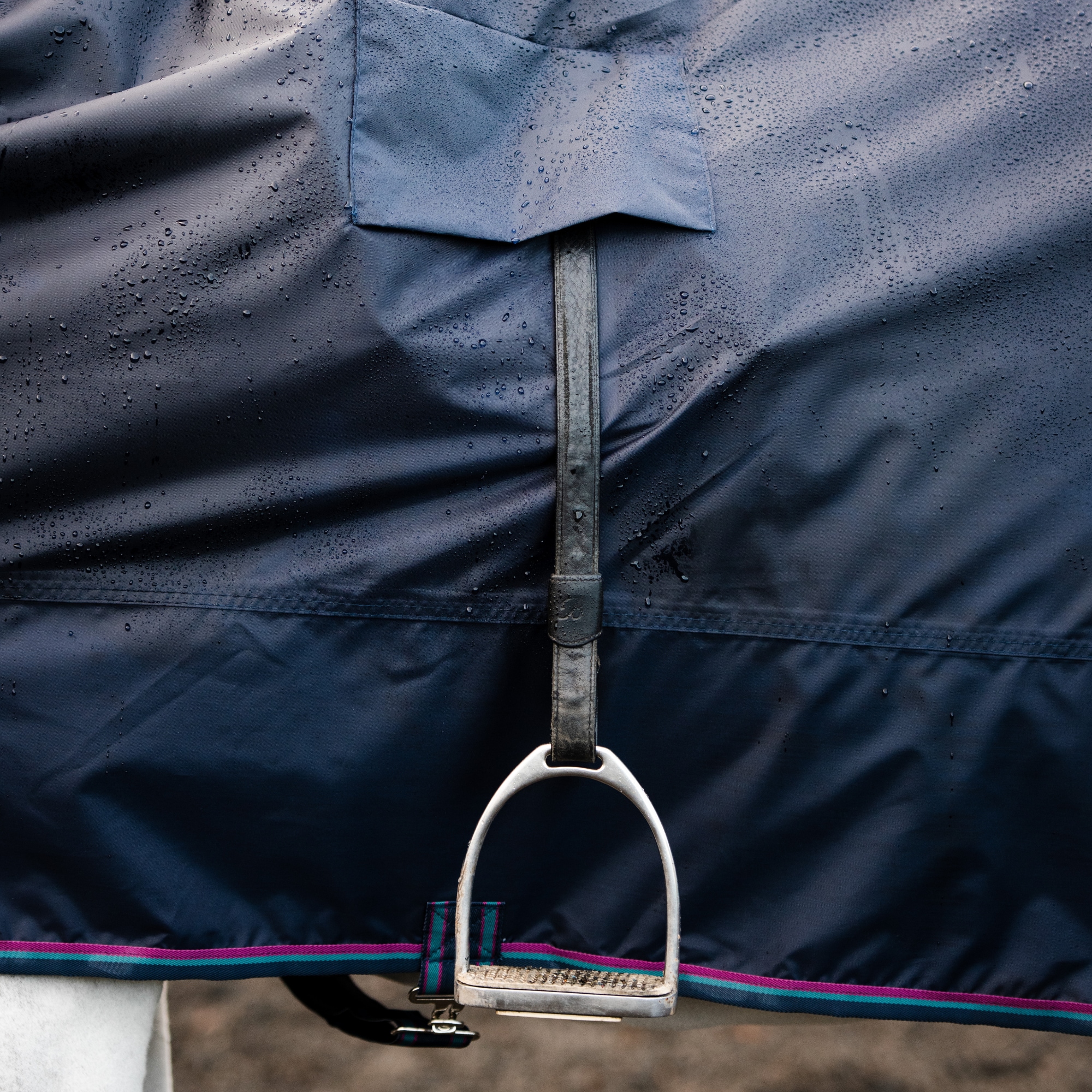 This lightweight rug is made from durable polyester and features a waterproof surface with a 3000 mm water column, making it highly resistant to rain and moisture. Thanks to the stirrup holes, you can ride with the rug on while keeping your saddle dry and protected.