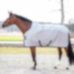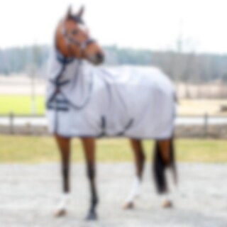 The upper section over the back and hindquarters is made from 600D ripstop polyester, providing lightweight waterproof protection during summer showers. The side panels are constructed from an airy mesh fabric that allows airflow while protecting against insects, making the rug particularly well suited for warm conditions.