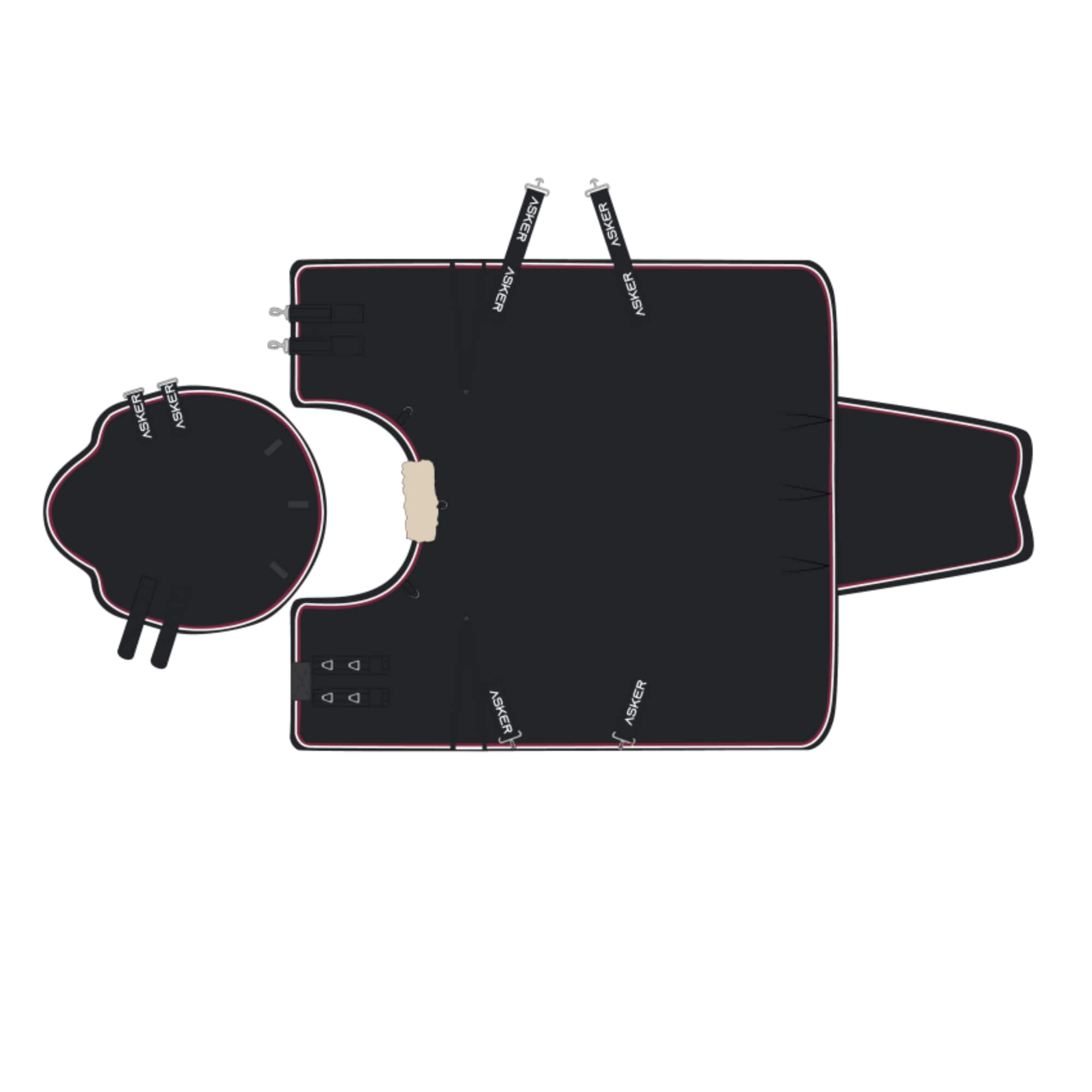 Asker TO Plus 1200D 200g in black is a durable and waterproof turnout rug that comes with a separate neck cover. Made from extra strong 1200 denier fabric, it offers excellent breathability and a comfortable fit.