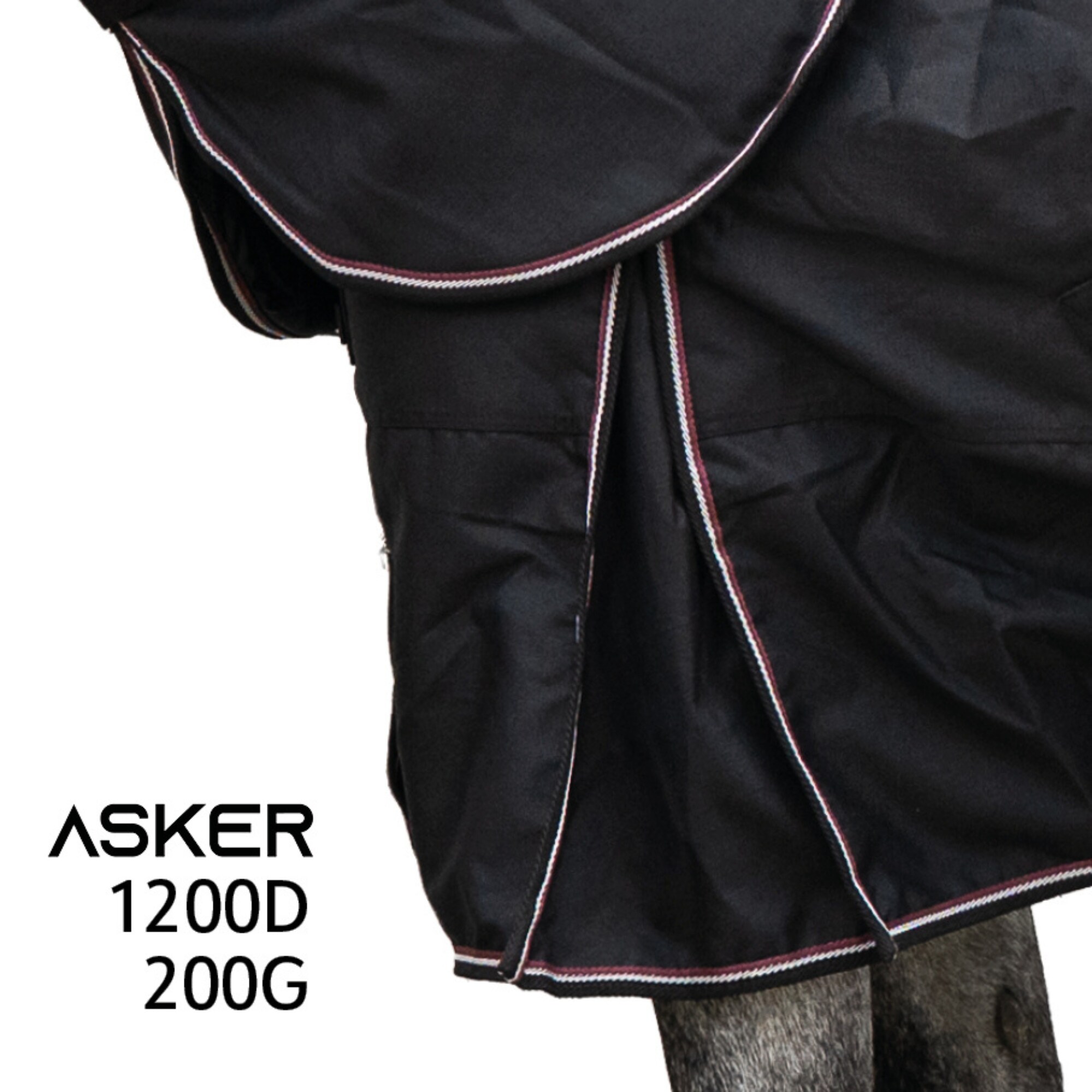 The Asker TO Plus 1200D 200g in black is a robust turnout rug designed to protect your horse against rain and wind in all seasons. The strong 1200 denier outer material makes it particularly resistant to wear, ideal for horses that are active in the field. With a waterproof rating of 3000 WP and high breathability, the rug ensures your horse stays dry and comfortable even during prolonged wet weather.