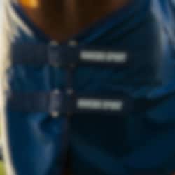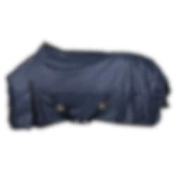 The HS Solid Turnout Rug in Navy is an unlined rain rug crafted from durable Diamond Ripstop 600 denier fabric. It features a smooth, anti-static nylon lining to reduce the risk of rubbing, along with a soft synthetic wither pad for enhanced comfort.