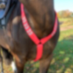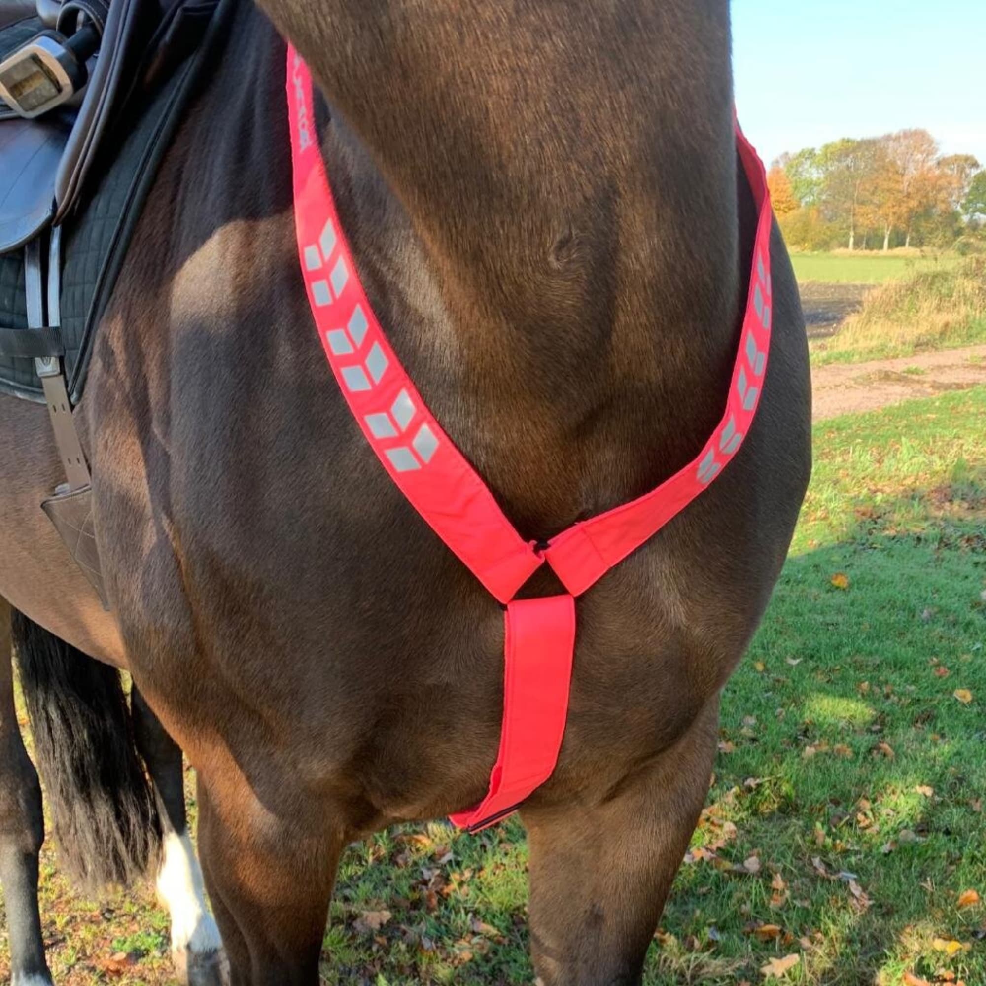 A double sided reflective breastplate to keep you and your horse visible in winter. Adjustable to fit both pony and horse. Securely kept in place by the neck strap and girth loop.