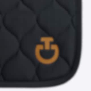 This jumping saddle pad from Cavalleria Toscana is incredibly stylish with beautifully quilted squares. The Circular Quilted Jersey jumping pad comes in black with the CT logo in the color Foxtrot, black piping, and a black spine channel featuring Cavalleria Toscana text and logo.