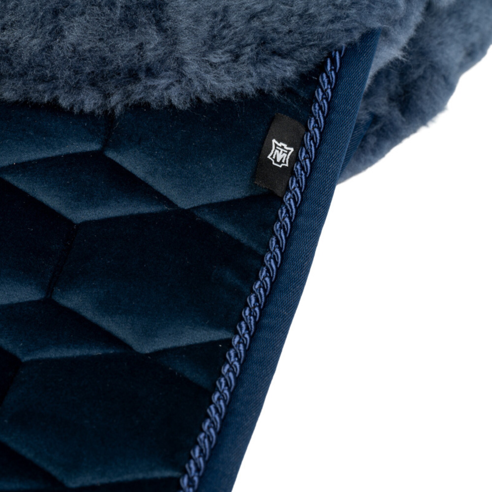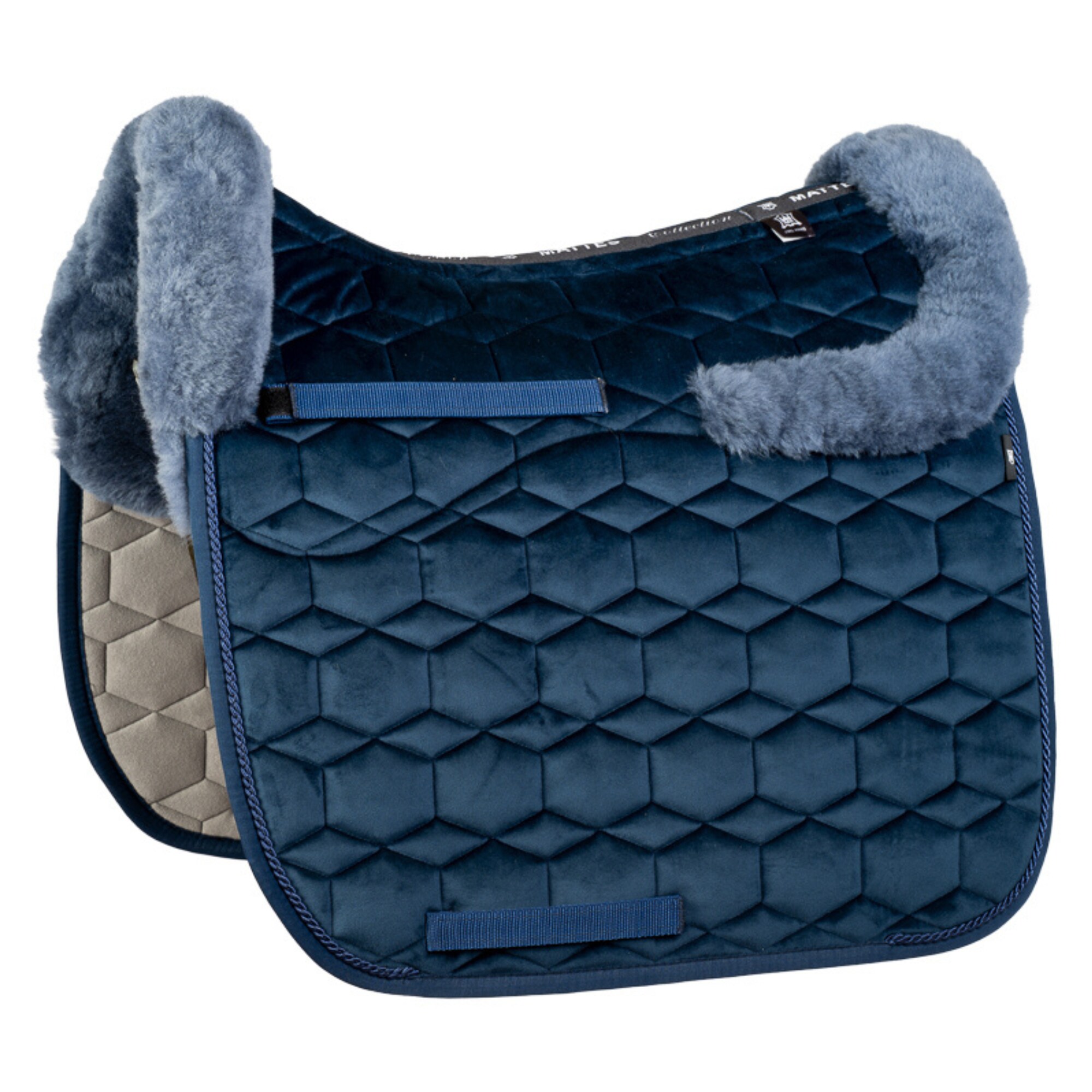 The sheepskin saddle pad comes in navy with blue sheepskin and one beautiful piping detail along the edges.