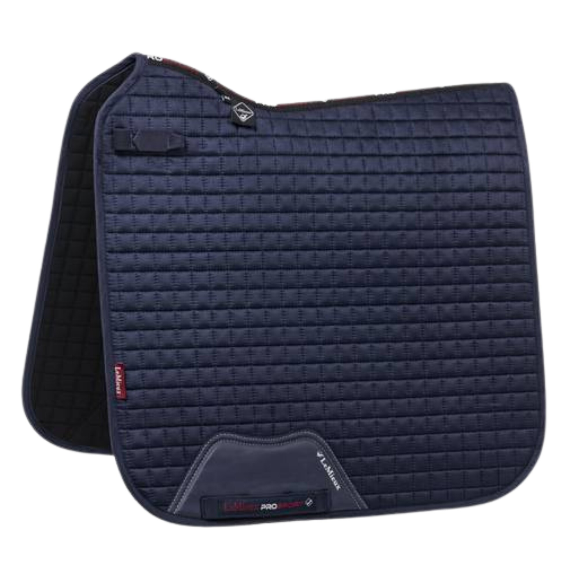 Nicely quilted dressage saddle pad in a suede-like navy material from LeMieux.