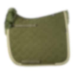 The sheepskin saddle pad is olive with olive sheepskin and features two beautiful piping details along the edge of the pad.