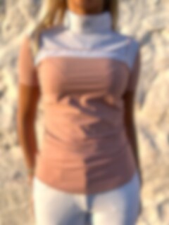 This is a supernice and comfortable competition shirt with short sleeve in a very stretchy material. The competition shirt is in pink with white at the top of the shirt. The fabric at the top under the collar is in a net material which provides extra good ventilation during warm competition days. The competition shirt is easy to put on and off as the collar has both hidden buttons and a zipper to open it with.