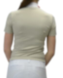 The shirt is made of a beige fabric which is printed over the chest with small horses, a very nice detail. The collar is white and on the left chest there are orange stones that together form the ANIMO logo.