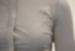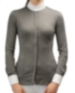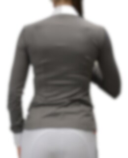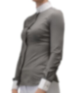 This shirt is in a very comfortable material and is feminine cut. It is in a grey color and has a white collar and cuffs. On the left chest is an ANIMO logo placed, it is made of gray stones that match very well with the shirt's color. The competition shirt openeds with buttons.