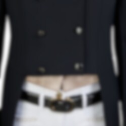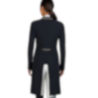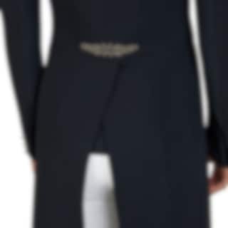 The competition tailcoat features interchangeable pockets and lapels, and rhinestone appliqués on the collar, waistband, and edges add a subtle yet luxurious touch. The shiny black buttons at the cuffs and hem, with their contrasting profile, give the tailcoat a modern and sophisticated finish.